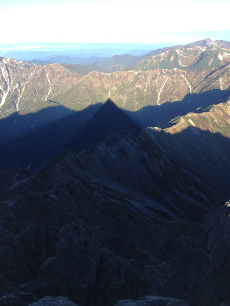早朝、槍ヶ岳の頂きに立った時、西に綺麗な三角錐の影が現れました。「影槍」です。そう簡単に何度も来られる場所ではないので、本当にラッキーでした。